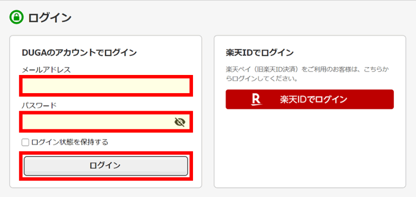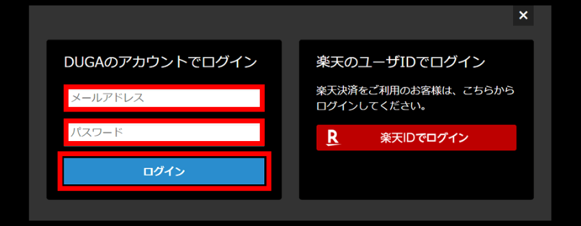 エラーメッセージが表示されるなどで、正常にログインできない場合はDUGAのウエブサイトで「ログインできない場合の原因と対処法」をご覧ください。