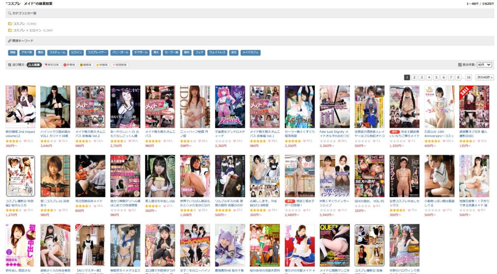 するとこのような画面が映し出されます、コスプレに特化した作品が多く出てきます。