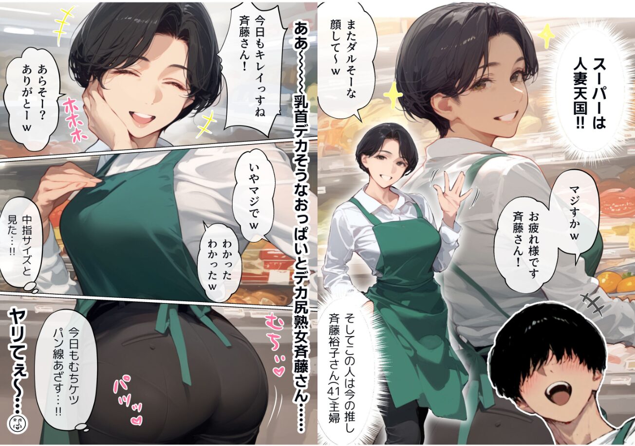 作家は『mamaya』、掲載誌・レーベルは『アルピス工房』です、登場人物は『吉沢涼介(21)』と涼介のバイト先の推しである、スーパーのパート主婦、『斉藤裕子(41)』、この二人が濃厚な職場不倫関係の仲に陥っていくという物語です。